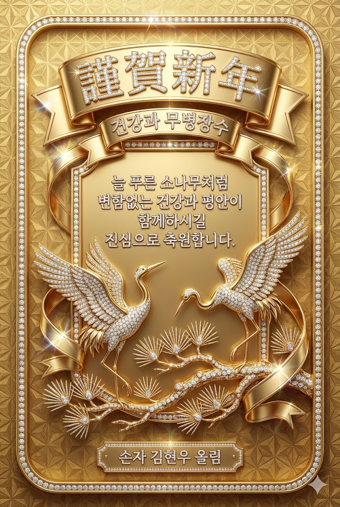 - 완벽한 레이아웃: 제목, 부제, 본문, 발신인까지 연하장의 모든 격식을 보석 공예 스타일로 배치했습니다.