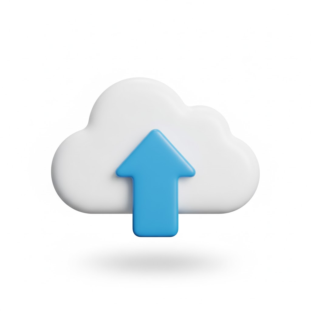 A sleek, 3D icon of a [cloud with an upload arrow] with soft shadows and a clean, glossy finish, rendered in a modern, vibrant cartoon style against a white background, fitting for a Windows application.