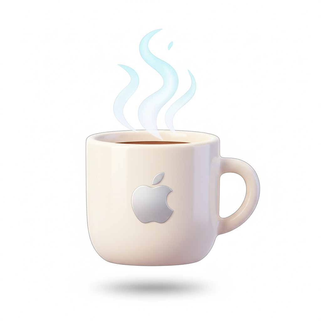 A sleek, 3D icon of a [coffee cup with steam rising] with soft shadows and a clean, glossy finish, rendered in a modern, vibrant cartoon style against a white background, tailored for macOS aesthetics.