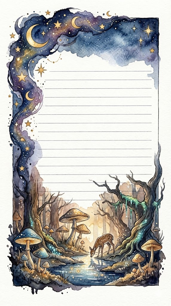 watercolor illustration style, clean white paper texture, smooth paper, ink bleed effects, muted warm colors. A vertical sheet of lined note paper. The top and side borders are composed of celestial elements, golden stars, crescent moons, and swirling deep blue and purple tones, with a rough, watercolor ink bleed appearance, framing a textured sky background at the top. Below the ruled lines at the bottom is a detailed scene of a mystical forest at night with glowing mushrooms, ancient trees, and a small deer drinking from a sparkling stream, illustrated in the same watercolor style. No text is present. --ar 9:16