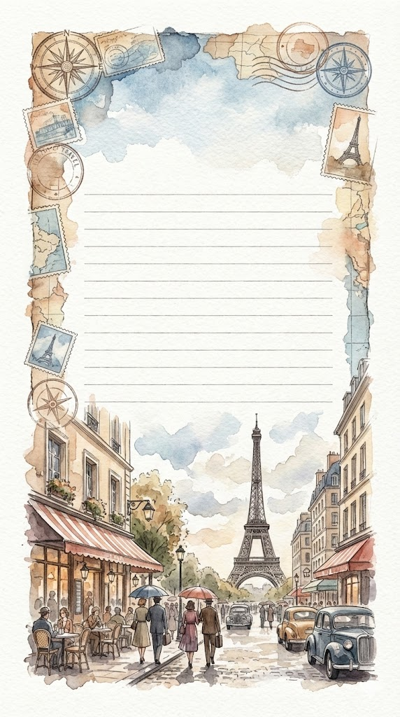 watercolor illustration style, clean white paper texture, smooth paper, ink bleed effects, muted warm colors. A vertical sheet of lined note paper. The top and side borders are composed of vintage travel stamps, compass roses, and faded map elements in sepia and soft blue tones, with a rough, watercolor ink bleed appearance, framing a textured sky background at the top. Below the ruled lines at the bottom is a detailed scene of a bustling street scene in Paris with the Eiffel Tower in the distance, cafes with awnings, and people carrying umbrellas, illustrated in the same watercolor style. No text is present. --ar 9:16