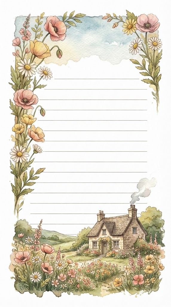 watercolor illustration style, clean white paper texture, smooth paper, ink bleed effects, muted warm colors. A vertical sheet of lined note paper. The top and side borders are composed of intertwined wildflowers, poppies, daisies, and green leaves with soft pink and yellow pastel colors, with a rough, watercolor ink bleed appearance, framing a textured sky background at the top. Below the ruled lines at the bottom is a detailed scene of a cozy stone cottage with smoke rising from the chimney, surrounded by a blooming flower garden and rolling green hills, illustrated in the same watercolor style. No text is present. --ar 9:16