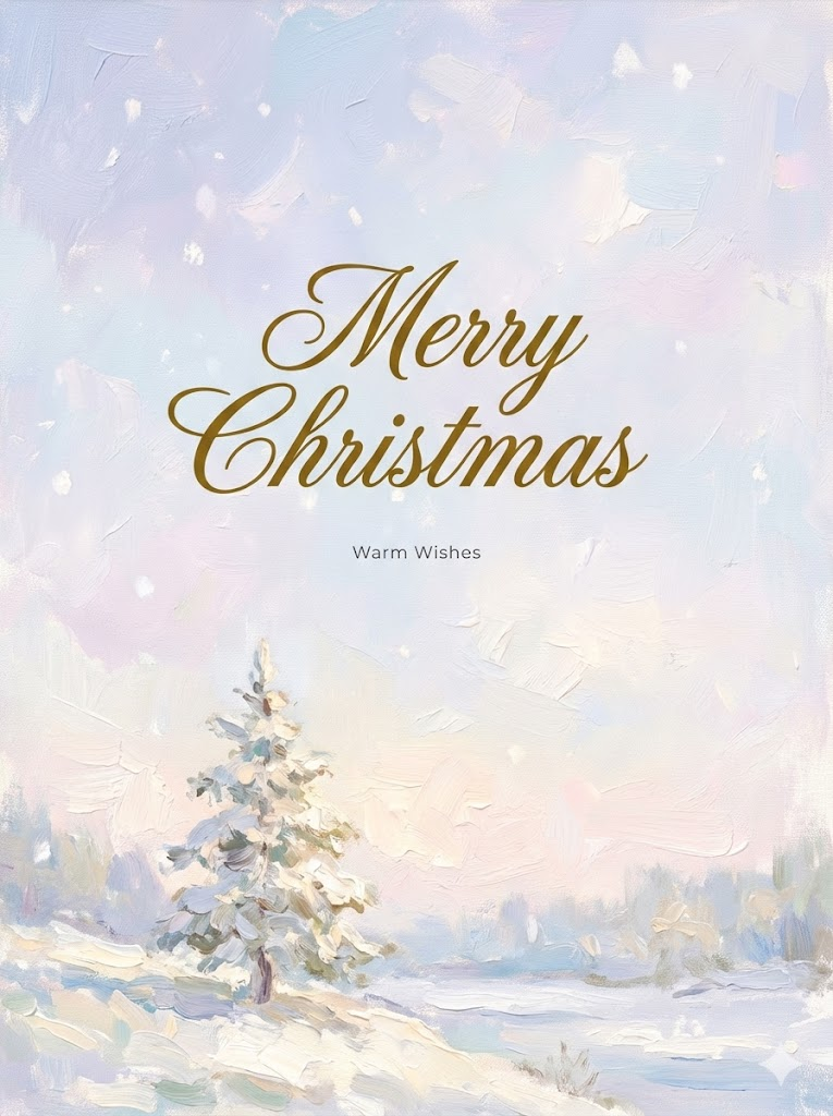 High-quality Christmas greeting card design, vertical aspect ratio 3:4. COMPOSITION: Extensive negative space at the top and center for breathing room, complying with the rule of thirds. SUBJECT: A soft, snowy winter landscape with a single pine tree painted in the artistic style of Claude Monet. STYLE: Visible brushstrokes, artistic texture, gentle pastel, soft lighting, serene atmosphere. TYPOGRAPHY: The design integrates text elements seamlessly. 1) Main Title: Large, bold, elegant typography reading "Merry Christmas". 2) Subtitle: Very small, minimalist, sans-serif text below reading "Warm Wishes". TECHNICAL: Masterpiece, 8k resolution, highly detailed, sharp focus, aesthetic layout --ar 3:4