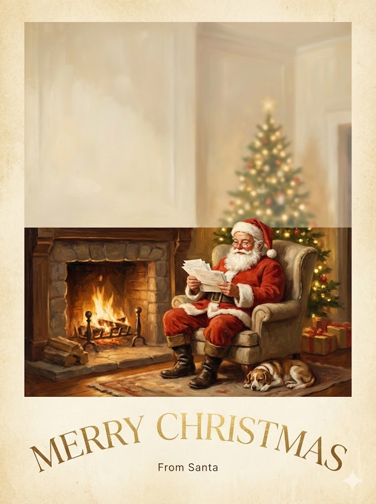 High-quality Christmas greeting card design, vertical aspect ratio 3:4. COMPOSITION: Extensive negative space at the top and center for breathing room, complying with the rule of thirds. SUBJECT: A Santa Claus reading letters by a fireplace painted in the artistic style of Norman Rockwell. STYLE: Visible brushstrokes, artistic texture, nostalgic and warm atmosphere. TYPOGRAPHY: The design integrates text elements seamlessly. 1) Main Title: Large, bold, elegant typography reading "MERRY CHRISTMAS". 2) Subtitle: Very small, minimalist, sans-serif text below reading "From Santa". TECHNICAL: Masterpiece, 8k resolution, highly detailed, sharp focus, aesthetic layout --ar 3:4