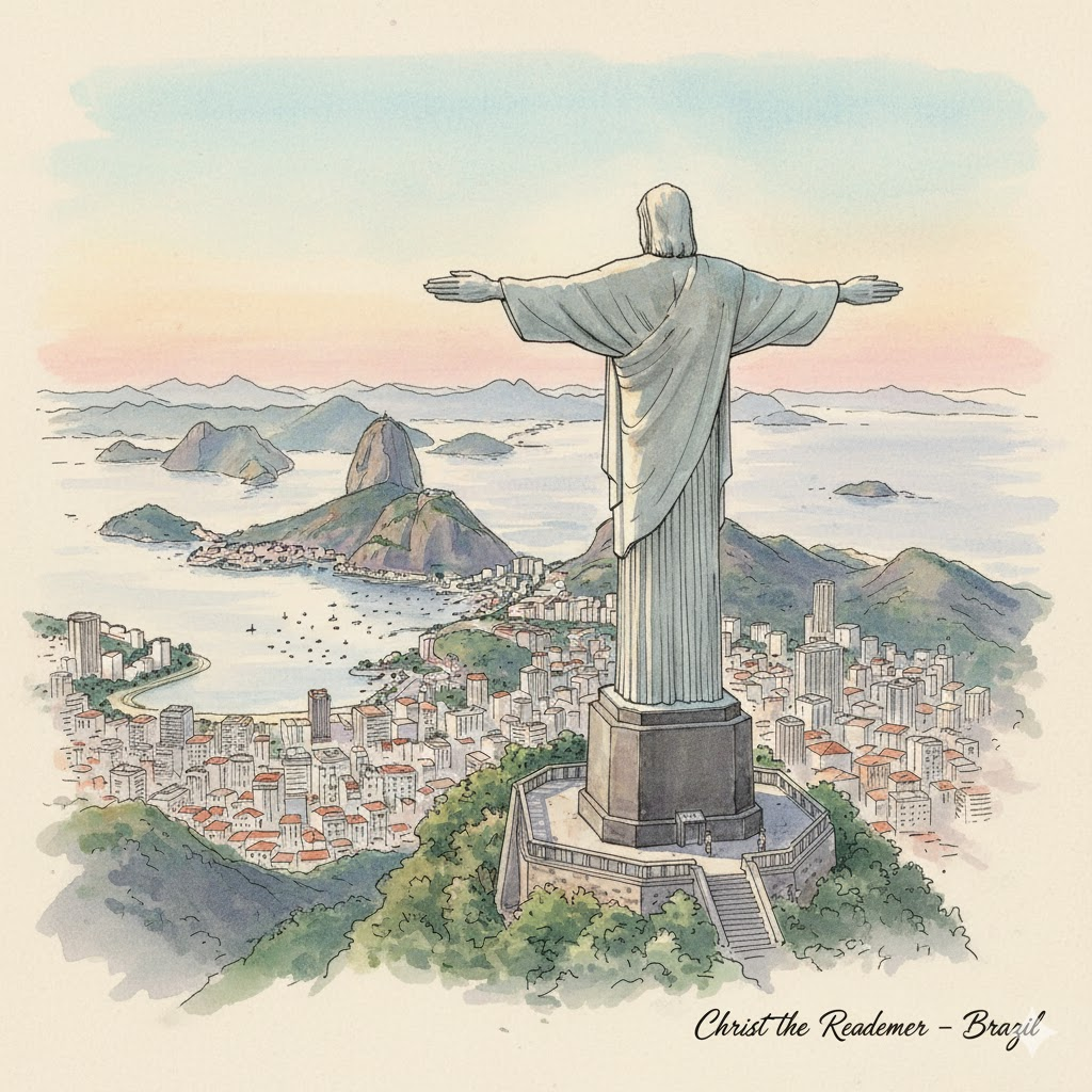 Watercolor and ink sketch of Christ the Redeemer statue overlooking Rio de Janeiro, in the style of a travel postcard. Soft pastel colors, clean lines, serene atmosphere. No watermarks. Small, elegant text in the bottom right corner: Christ the Redeemer - Brazil.