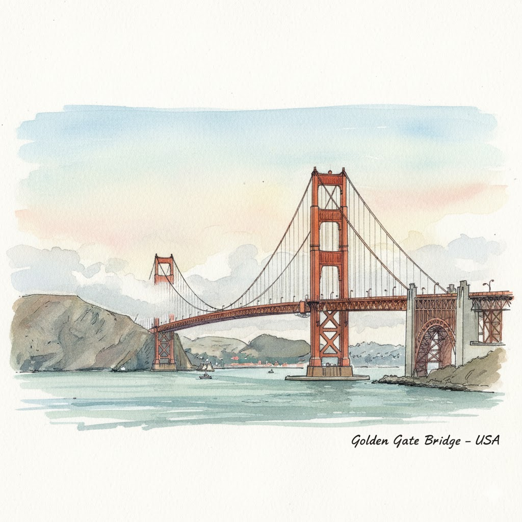 Watercolor and ink sketch of the Golden Gate Bridge shrouded slightly in fog, in the style of a travel postcard. Soft pastel colors, clean lines, serene atmosphere. No watermarks. Small, elegant text in the bottom right corner: Golden Gate Bridge - USA.