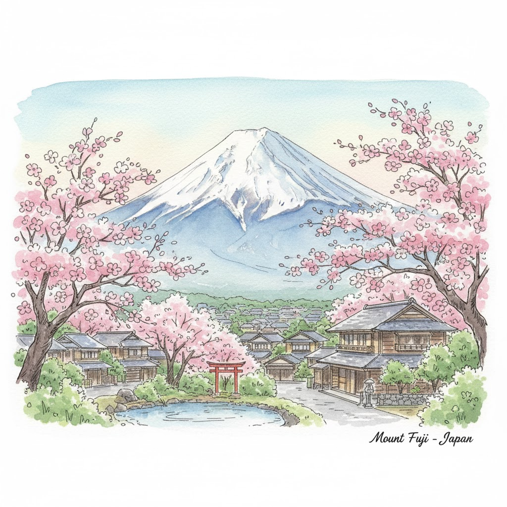 Watercolor and ink sketch of Mount Fuji with cherry blossoms and a traditional Japanese village at its base, in the style of a travel postcard. Soft pastel colors, clean lines, serene atmosphere. No watermarks. Small, elegant text in the bottom right corner: Mount Fuji - Japan.