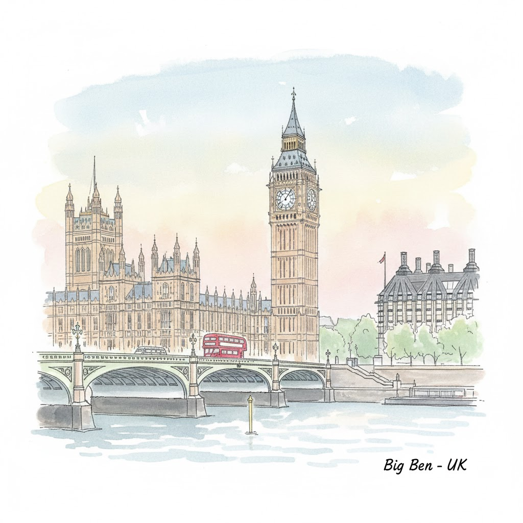 Watercolor and ink sketch of Big Ben and the Houses of Parliament, in the style of a travel postcard. Soft pastel colors, clean lines, serene atmosphere. No watermarks. Small, elegant text in the bottom right corner: Big Ben - UK.