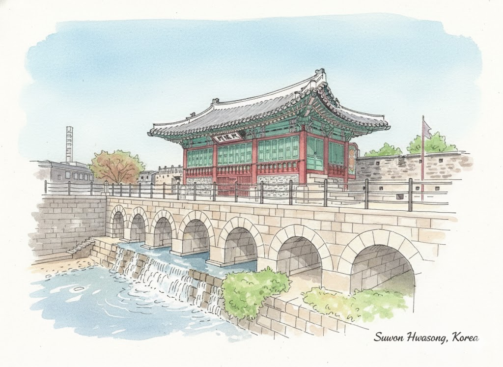 Watercolor and ink sketch of [업로드 이미지], in the style of a travel postcard. Soft pastel colors, clean lines, serene atmosphere. No watermarks. Small, elegant text in the bottom right corner: Suwon Hwaseong, Korea