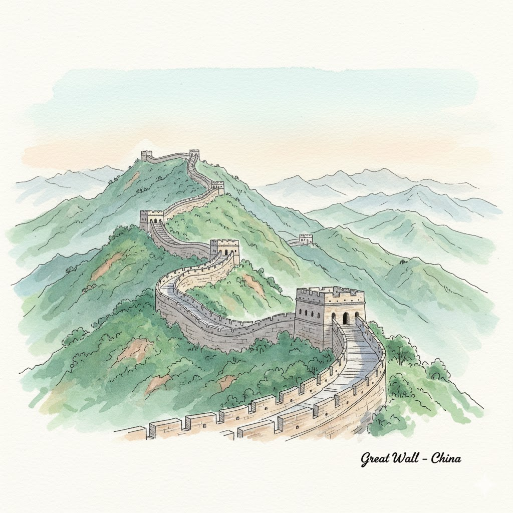 Watercolor and ink sketch of [DESCRIPTION OF LANDMARK AND ITS SURROUNDINGS], in the style of a travel postcard. Soft pastel colors, clean lines, serene atmosphere. No watermarks. Small, elegant text in the bottom right corner: [LANDMARK NAME IN ENGLISH] - [COUNTRY NAME IN ENGLISH].