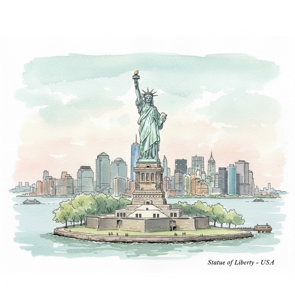 Watercolor and ink sketch of the Statue of Liberty on Liberty Island with the Manhattan skyline in the background, in the style of a travel postcard. Soft pastel colors, clean lines, serene atmosphere. No watermarks. Small, elegant text in the bottom right corner: Statue of Liberty - USA.