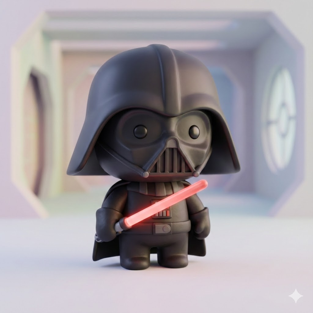 A high-quality 3D minimalist vinyl toy figure of [Darth Vader holding a red lightsaber], rendered in a cute chibi style with a large head and small body. Simple black dot eyes, smooth rounded geometry, texture resembles soft matte plastic and clay. The background depicts a blurred, minimalist version of a setting iconic to the character. Soft and diffuse studio lighting, typical of high-end character design, Octane render, 4k, soft pastel colors, clean composition, depth of field, center focus.