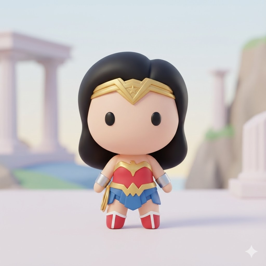 A high-quality 3D minimalist vinyl toy figure of [Wonder Woman], rendered in a cute chibi style with a large head and small body. Simple black dot eyes, smooth rounded geometry, texture resembles soft matte plastic and clay. The background depicts a blurred, minimalist version of a setting iconic to the character. Soft and diffuse studio lighting, typical of high-end character design, Octane render, 4k, soft pastel colors, clean composition, depth of field, center focus.