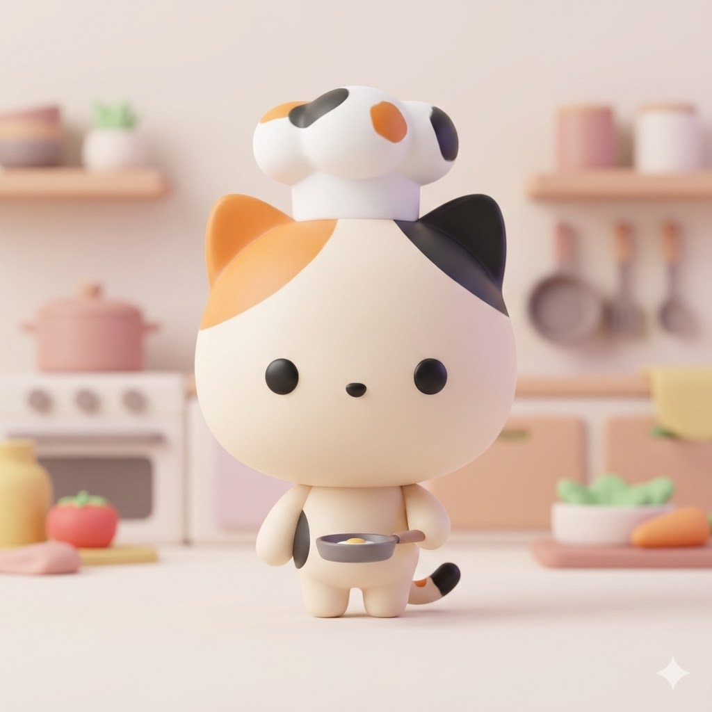 A high-quality 3D minimalist vinyl toy figure of [a Calico Cat wearing a chef hat and holding a frying pan], rendered in a cute chibi style with a large head and small body. Simple black dot eyes, smooth rounded geometry, texture resembles soft matte plastic and clay. The background depicts a blurred, minimalist version of a setting iconic to the character. Soft and diffuse studio lighting, typical of high-end character design, Octane render, 4k, soft pastel colors, clean composition, depth of field, center focus.