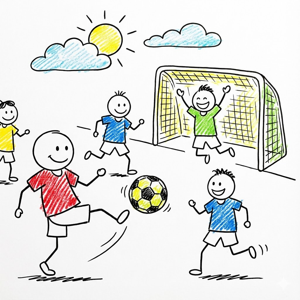 A hand-drawn stick figure illustration of children playing a soccer match with a soccer ball, in a colorful doodle style. The artwork features simple black ink outlines with vibrant, expressive scribbles of color. Each character should have a circular head with a simple smiling face and thin stick limbs. The style is whimsical, childlike, and energetic, set against a clean white background. High contrast between the black lines and the bright primary colors. --ar 1:1