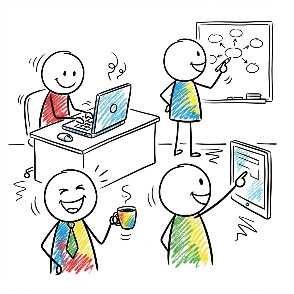 A hand-drawn stick figure illustration of team members working passionately in an office with laptops and coffee, in a colorful doodle style. The artwork features simple black ink outlines with vibrant, expressive scribbles of color. Each character should have a circular head with a simple smiling face and thin stick limbs. The style is whimsical, childlike, and energetic, set against a clean white background. High contrast between the black lines and the bright primary colors.--ar 1:1