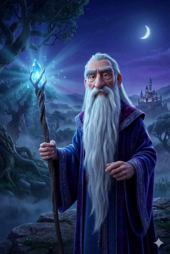 Style & Subject Reference: Based directly on the subject in the [a wise old wizard with a long white beard holding a glowing magical staff], generate a Pixar Animation Studios style 3D CGI render. The transformation should preserve the full likeness and features of the input subject, translating them into stylized yet realistic character proportions that balance exaggerated animation appeal with believable physical presence.