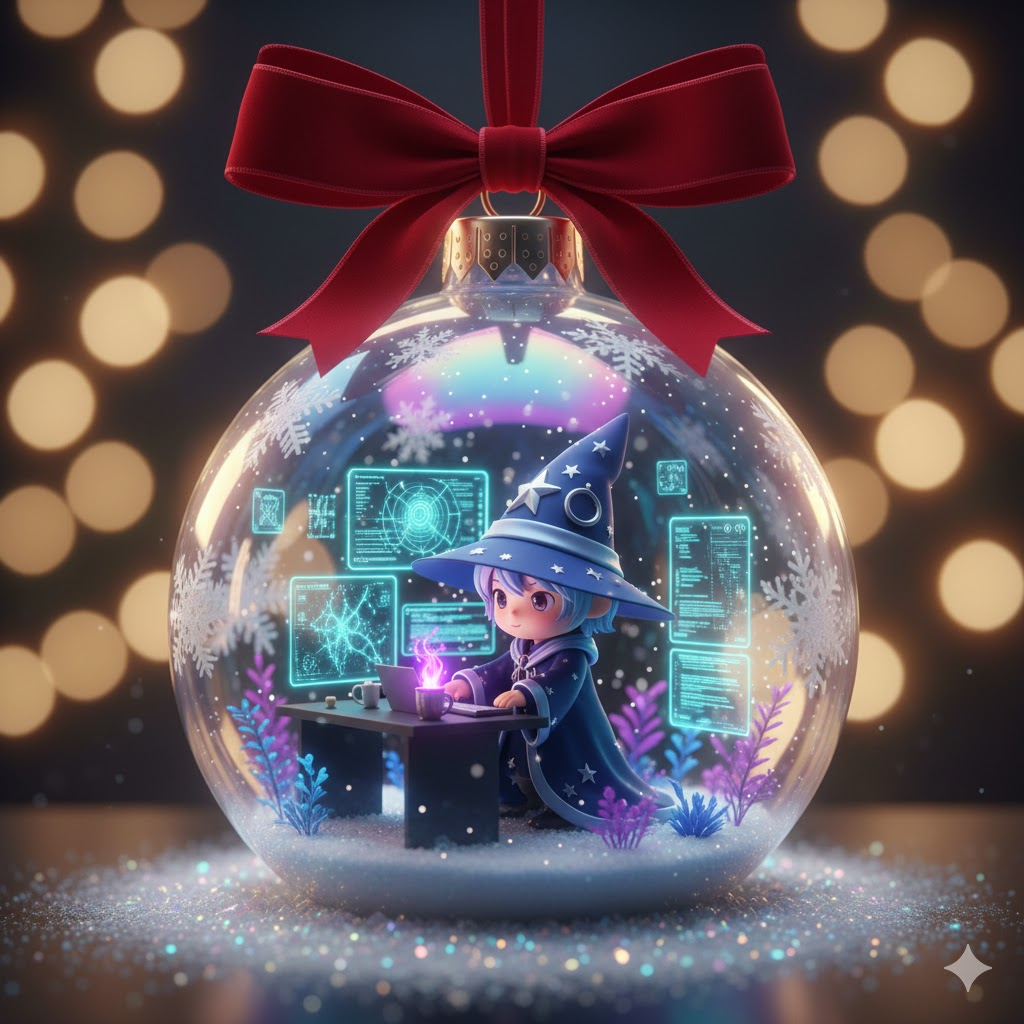 A transparent, iridescent Christmas bauble hanging from a velvet crimson ribbon, adorned with delicate frost patterns. Encased within, a miniature diorama featuring a charming 3D chibi character, [wearing a wizard's robe and a pointed hat], engrossed in work at a sleek, minimalist AI workstation. The desk showcases a trio of shimmering holographic screens displaying intricate neural network visualizations and cascading lines of glowing code. Adorn the scene with microscopic bioluminescent flora, a tiny steaming mug of [magical glowing elixir], and ambient, warm LED strip lighting. Subtle, luminous UI elements float gracefully around the character. A gentle scattering of iridescent snow-glitter forms a magical base. The entire bauble emits a soft, ethereal Christmas glow, with dramatic cinematic reflections dancing on its glass surface, creating an exquisite, high-fidelity diorama. The overall aesthetic is one of enchanting whimsy, luxurious detail, and profound warmth, bathed in a shallow depth of field, celebrating the festive spirit with ultra-polished materials and intricate fidelity.