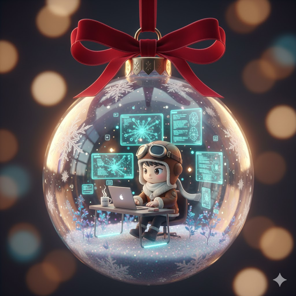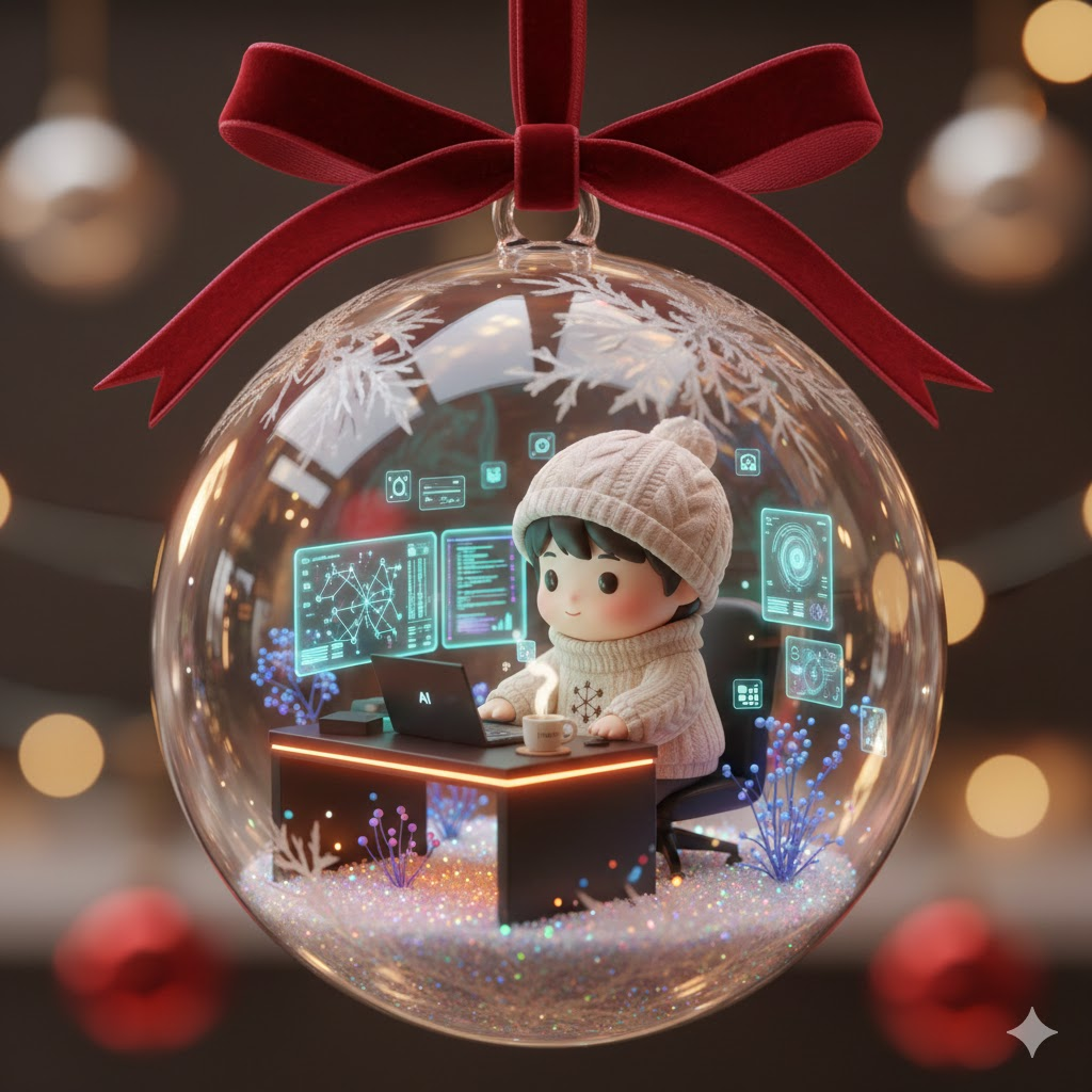 A transparent, iridescent Christmas bauble hanging from a velvet crimson ribbon, adorned with delicate frost patterns. Encased within, a miniature diorama featuring a charming 3D chibi character, [wearing a cozy knitted sweater], engrossed in work at a sleek, minimalist AI workstation. The desk showcases a trio of shimmering holographic screens displaying intricate neural network visualizations and cascading lines of glowing code. Adorn the scene with microscopic bioluminescent flora, a tiny steaming mug of [earl grey tea], and ambient, warm LED strip lighting. Subtle, luminous UI elements float gracefully around the character. A gentle scattering of iridescent snow-glitter forms a magical base. The entire bauble emits a soft, ethereal Christmas glow, with dramatic cinematic reflections dancing on its glass surface, creating an exquisite, high-fidelity diorama. The overall aesthetic is one of enchanting whimsy, luxurious detail, and profound warmth, bathed in a shallow depth of field, celebrating the festive spirit with ultra-polished materials and intricate fidelity.