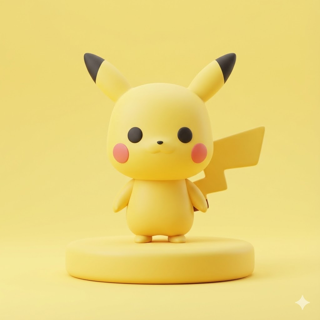 A standalone high-quality 3D vinyl art toy figure of Pikachu, full body shot, centered composition. Cute chibi proportions, large head, tiny body, simple black dot eyes, clean smooth geometry. Material is premium matte PVC with a soft clay-like finish. The character is standing on a simple podium against a bright pastel yellow studio background. Soft diffuse lighting, slight depth of field, Octane render, 4k, minimalist masterpiece.