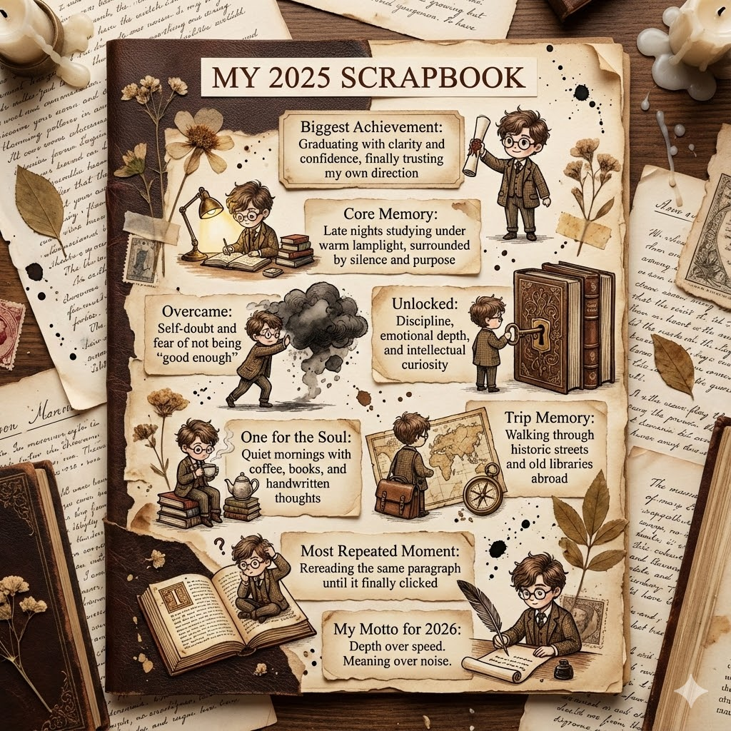 A top-down photograph of an elegant Dark Academia scrapbook page, presenting a vintage and moody aesthetic. The scrapbook appears handcrafted with layers of aged parchment paper, rich leather textures, dried pressed florals, and antique ink stains, arranged in a refined yet slightly chaotic academic layout. The color palette is deep, featuring espresso brown, sepia tones, charcoal grey, and muted gold accents. The background beneath the scrapbook page resembles a cluttered academic desk surface with handwritten notes, margins of old books, and subtle wax drips from candles. At the very top, the title “MY 2025 SCRAPBOOK” is rendered in classic serif typography.