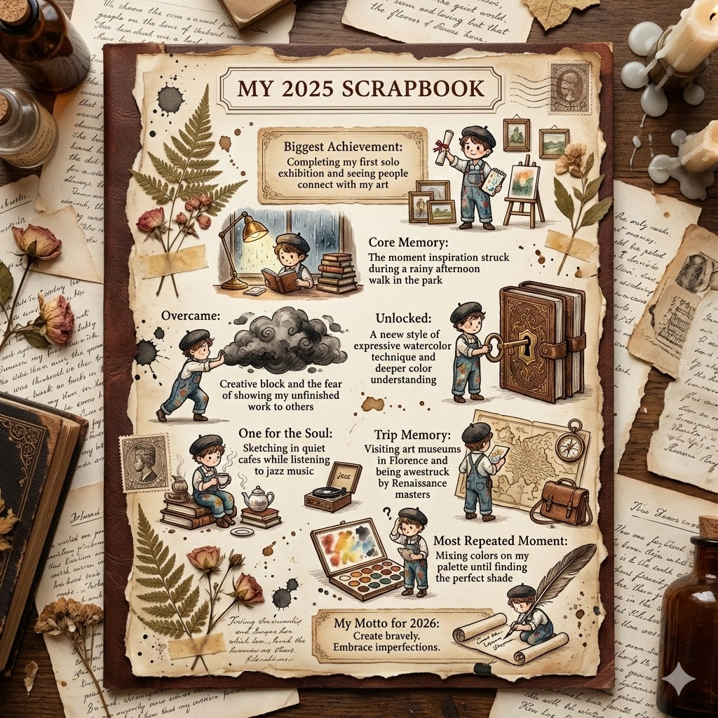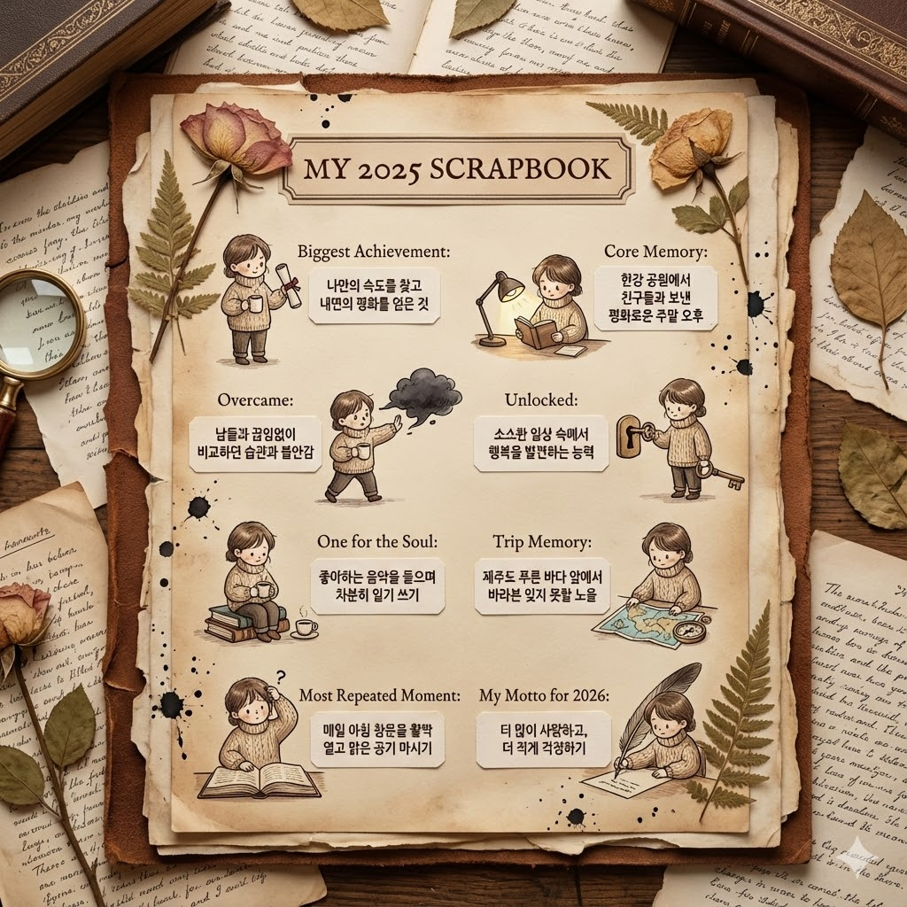 - 나만의 미니 캐릭터: 단순히 텍스트만 나열하는 것이 아닙니다. 여러분의 모습을 딴 작은 '잉크 앤 수채화' 스타일의 캐릭터가 스크랩북 곳곳에 등장하여, 각 항목의 내용에 맞는 행동(예: '성취' 항목에서 졸업장을 들고 있음)을 취합니다. 이는 이미지에 생동감과 깊은 개인적 연결고리를 부여합니다.