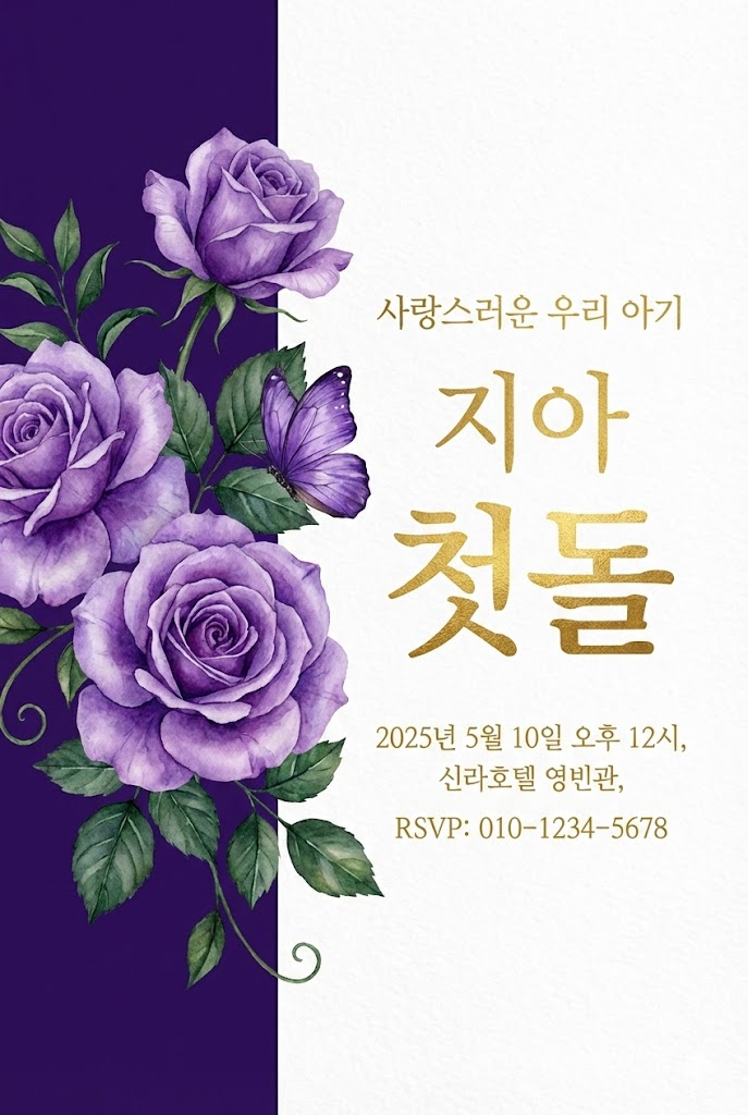 A direct, flat view of a sophisticated and elegant vertical invitation card design, full-bleed edge-to-edge digital graphic illustration. No borders, no margins, no external background. Aspect ratio: 2:3. The background is vertically divided into two distinct sections: the left section covers 1/3 of the card's width with [a solid deep color, e.g., solid deep purple], and the right section covers the remaining 2/3 with [a light, airy watercolor texture, e.g., white watercolor texture]. All typography and text elements are strictly placed and centered within the right 2/3 section. Beautifully rendered [specific watercolor flowers and botanical elements, e.g., watercolor purple roses and botanical leaves] are primarily positioned in the left 1/3 section but artistically overlap and bleed into the right 2/3 section, with [a realistic small animal or insect, e.g., a realistic purple butterfly] perched among them. The main text on the right includes the phrase "[Introductory Phrase, e.g., 사랑스러운 우리 아기]" in luxurious gold script, the name "[Child's Name, e.g., 지아]" in elegant gold typography, and the word "[Main Event Title, e.g., 첫돌 or ONE]" in large, bold gold foil letters. All secondary details: "[Date, Time, Location]" are written in clean gold and white sans-serif fonts on the right side. The overall atmosphere is royal, elegant, and celebratory.