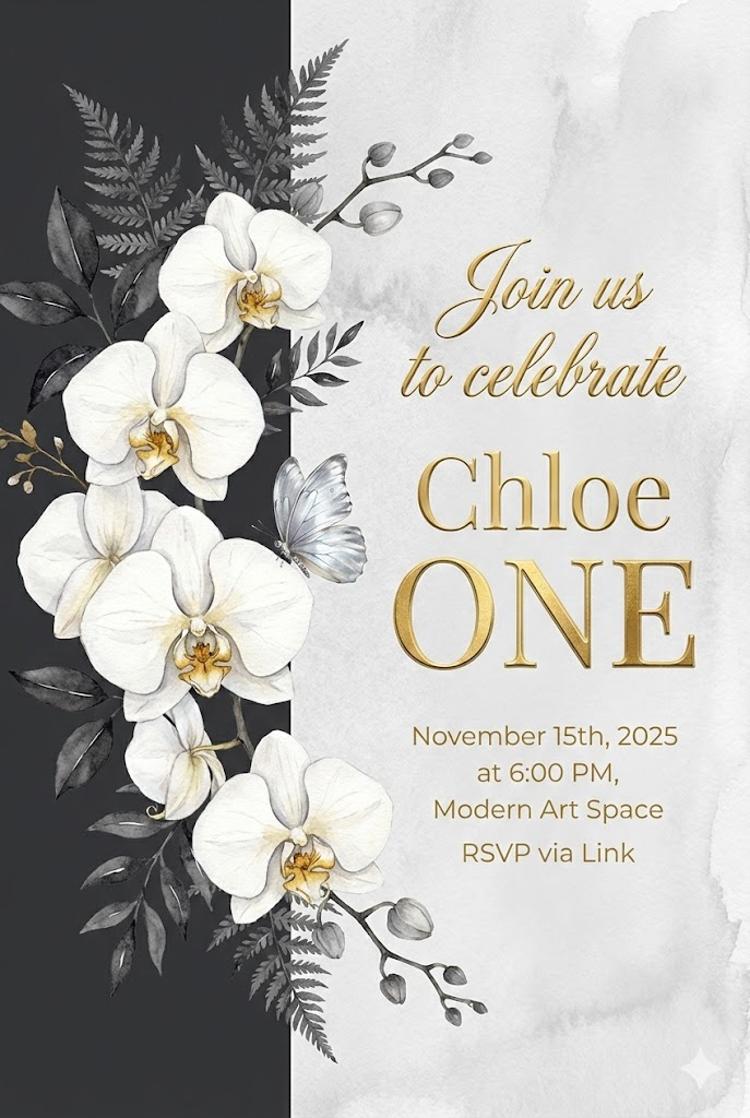 A direct, flat view of a sophisticated and elegant vertical invitation card design, full-bleed edge-to-edge digital graphic illustration. No borders, no margins, no external background. Aspect ratio: 2:3. The background is vertically divided into two distinct sections: the left section covers 1/3 of the card's width with solid matte charcoal, and the right section covers the remaining 2/3 with light silver watercolor texture. All typography and text elements are strictly placed and centered within the right 2/3 section. Beautifully rendered watercolor white orchids and charcoal leaves are primarily positioned in the left 1/3 section but artistically overlap and bleed into the right 2/3 section, with a realistic small silver butterfly perched among them. The main text on the right includes the phrase "Join us to celebrate" in luxurious gold script, the name "Chloe" in elegant gold typography, and the word "ONE" in large, bold gold foil letters. All secondary details: "November 15th, 2025 at 6:00 PM, Modern Art Space, RSVP via Link" are written in clean gold and white sans-serif fonts on the right side. The overall atmosphere is royal, elegant, and celebratory.