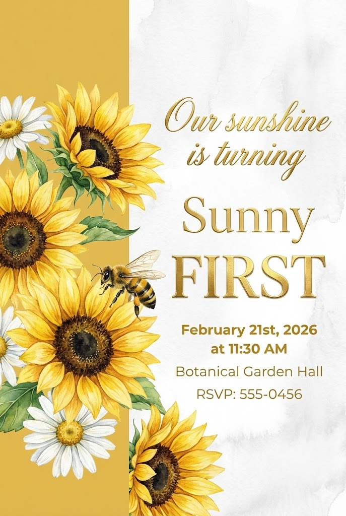 A direct, flat view of a sophisticated and elegant vertical invitation card design, full-bleed edge-to-edge digital graphic illustration. No borders, no margins, no external background. Aspect ratio: 2:3. The background is vertically divided into two distinct sections: the left section covers 1/3 of the card's width with solid golden honey yellow, and the right section covers the remaining 2/3 with white watercolor texture. All typography and text elements are strictly placed and centered within the right 2/3 section. Beautifully rendered watercolor sunflowers and daisies are primarily positioned in the left 1/3 section but artistically overlap and bleed into the right 2/3 section, with a realistic small honeybee perched among them. The main text on the right includes the phrase "Our sunshine is turning" in luxurious gold script, the name "Sunny" in elegant gold typography, and the word "FIRST" in large, bold gold foil letters. All secondary details: "February 21st, 2026 at 11:30 AM, Botanical Garden Hall, RSVP: 555-0456" are written in clean gold and white sans-serif fonts on the right side. The overall atmosphere is royal, elegant, and celebratory.