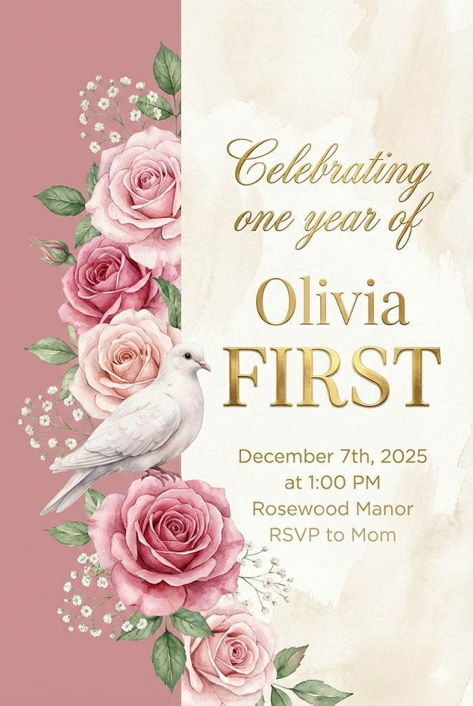A direct, flat view of a sophisticated and elegant vertical invitation card design, full-bleed edge-to-edge digital graphic illustration. No borders, no margins, no external background. Aspect ratio: 2:3. The background is vertically divided into two distinct sections: the left section covers 1/3 of the card's width with solid dusty rose, and the right section covers the remaining 2/3 with cream watercolor texture. All typography and text elements are strictly placed and centered within the right 2/3 section. Beautifully rendered watercolor pink roses and baby's breath are primarily positioned in the left 1/3 section but artistically overlap and bleed into the right 2/3 section, with a realistic small dove perched among them. The main text on the right includes the phrase "Celebrating one year of" in luxurious gold script, the name "Olivia" in elegant gold typography, and the word "FIRST" in large, bold gold foil letters. All secondary details: "December 7th, 2025 at 1:00 PM, Rosewood Manor, RSVP to Mom" are written in clean gold and white sans-serif fonts on the right side. The overall atmosphere is royal, elegant, and celebratory.