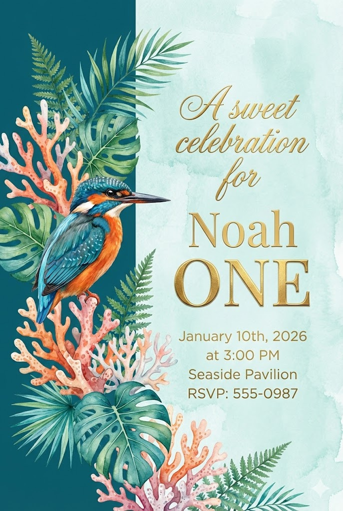 A direct, flat view of a sophisticated and elegant vertical invitation card design, full-bleed edge-to-edge digital graphic illustration. No borders, no margins, no external background. Aspect ratio: 2:3. The background is vertically divided into two distinct sections: the left section covers 1/3 of the card's width with solid deep teal, and the right section covers the remaining 2/3 with pale aqua watercolor texture. All typography and text elements are strictly placed and centered within the right 2/3 section. Beautifully rendered watercolor coral and tropical leaves are primarily positioned in the left 1/3 section but artistically overlap and bleed into the right 2/3 section, with a realistic small kingfisher bird perched among them. The main text on the right includes the phrase "A sweet celebration for" in luxurious gold script, the name "Noah" in elegant gold typography, and the word "ONE" in large, bold gold foil letters. All secondary details: "January 10th, 2026 at 3:00 PM, Seaside Pavilion, RSVP: 555-0987" are written in clean gold and white sans-serif fonts on the right side. The overall atmosphere is royal, elegant, and celebratory.