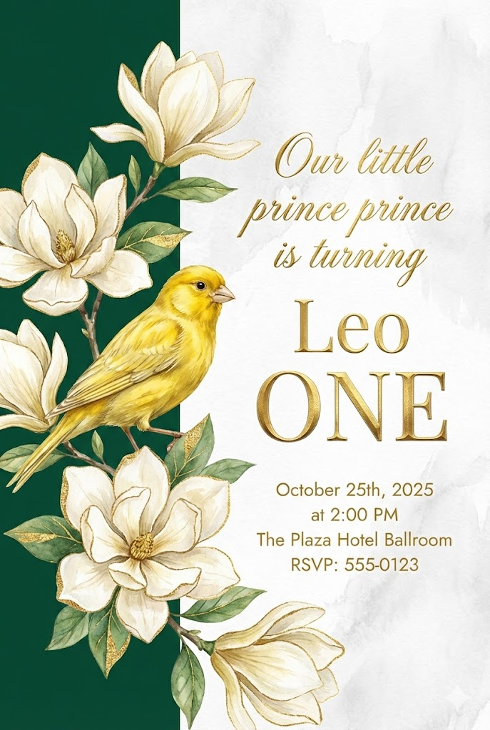 A direct, flat view of a sophisticated and elegant vertical invitation card design, full-bleed edge-to-edge digital graphic illustration. No borders, no margins, no external background. Aspect ratio: 2:3. The background is vertically divided into two distinct sections: the left section covers 1/3 of the card's width with solid emerald green, and the right section covers the remaining 2/3 with white watercolor texture. All typography and text elements are strictly placed and centered within the right 2/3 section. Beautifully rendered watercolor gold-leafed magnolias are primarily positioned in the left 1/3 section but artistically overlap and bleed into the right 2/3 section, with a realistic small yellow canary perched among them. The main text on the right includes the phrase "Our little prince is turning" in luxurious gold script, the name "Leo" in elegant gold typography, and the word "ONE" in large, bold gold foil letters. All secondary details: "October 25th, 2025 at 2:00 PM, The Plaza Hotel Ballroom, RSVP: 555-0123" are written in clean gold and white sans-serif fonts on the right side. The overall atmosphere is royal, elegant, and celebratory.