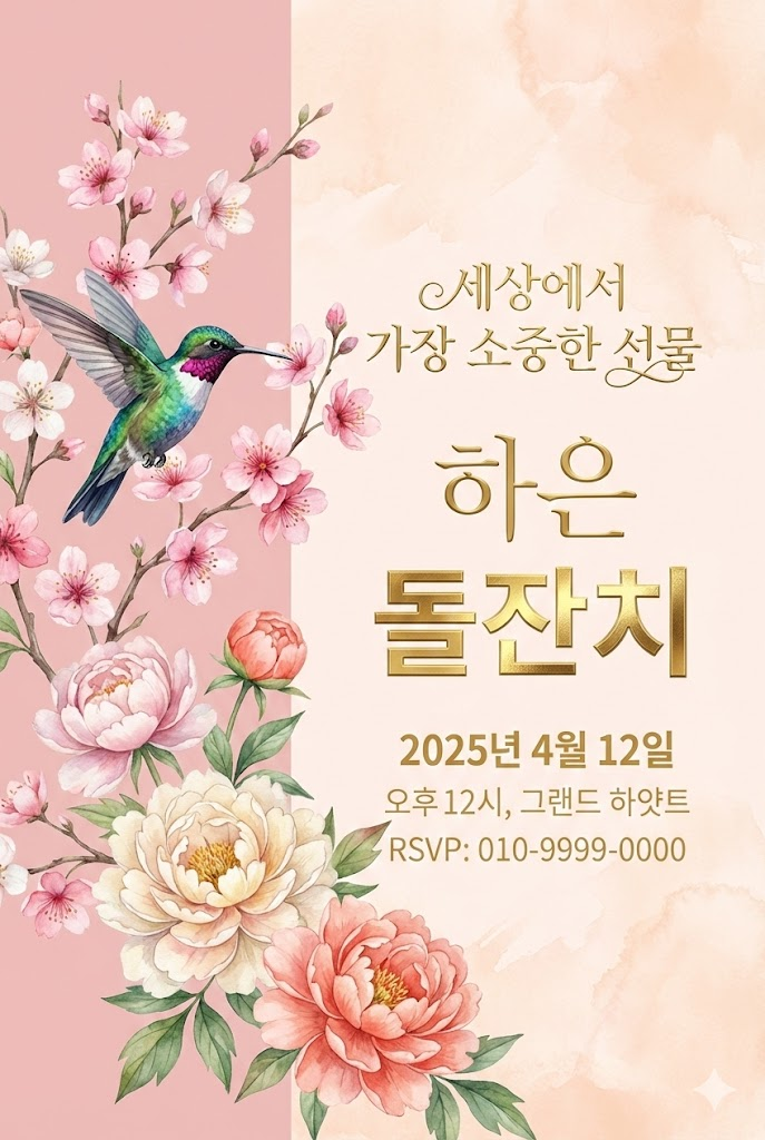 A direct, flat view of a sophisticated and elegant vertical invitation card design, full-bleed edge-to-edge digital graphic illustration. No borders, no margins, no external background. Aspect ratio: 2:3. The background is vertically divided into two distinct sections: the left section covers 1/3 of the card's width with solid blush pink, and the right section covers the remaining 2/3 with pale peach watercolor texture. All typography and text elements are strictly placed and centered within the right 2/3 section. Beautifully rendered watercolor cherry blossoms and peonies are primarily positioned in the left 1/3 section but artistically overlap and bleed into the right 2/3 section, with a realistic small hummingbird perched among them. The main text on the right includes the phrase "세상에서 가장 소중한 선물" in luxurious gold script, the name "하은" in elegant gold typography, and the word "돌잔치" in large, bold gold foil letters. All secondary details: "2025년 4월 12일 오후 12시, 그랜드 하얏트, RSVP: 010-9999-0000" are written in clean gold and white sans-serif fonts on the right side. The overall atmosphere is royal, elegant, and celebratory.