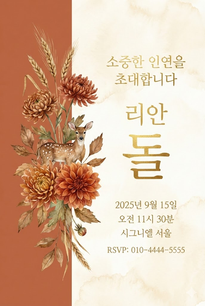 - 한글 타이틀의 고급화: "첫돌", "돌잔치" 등 우리말 타이틀이 금박(Gold Foil) 질감으로 큼직하게 배치되어 한국적인 돌잔치 분위기에 완벽히 녹아듭니다.
