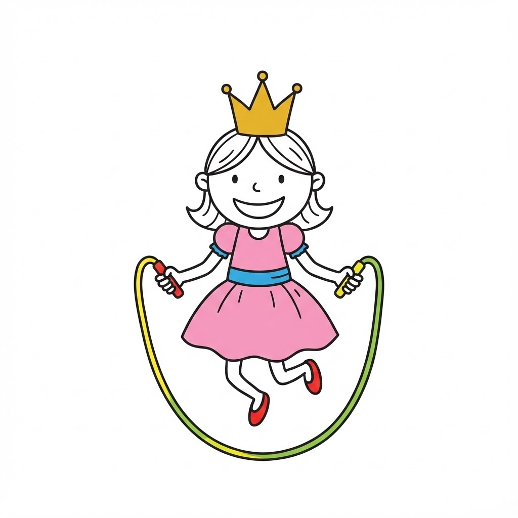 A whimsical hand-drawn doodle illustration of a little princess with a golden crown jumping rope with a bright smile, featuring simple clean black outlines and vibrant flat colors. The style is a minimalist children's drawing aesthetic, centered on a plain white background. Professional vector art quality with a playful and energetic atmosphere, no shadows, high resolution. --ar 1:1