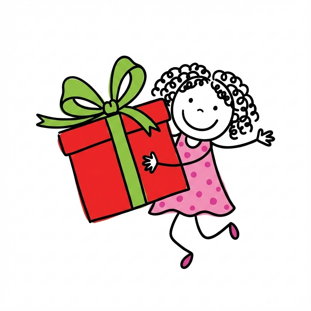 A whimsical hand-drawn doodle illustration of a happy girl in a pink dress holding a large red gift box with a green ribbon, featuring simple clean black outlines and vibrant flat colors. The style is a minimalist children's drawing aesthetic, centered on a plain white background. Professional vector art quality with a playful and energetic atmosphere, no shadows, high resolution. --ar 1:1