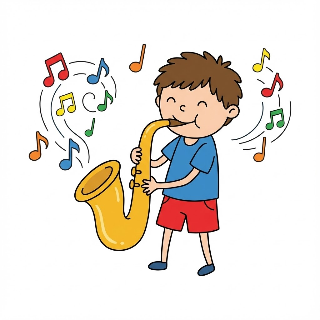 A whimsical hand-drawn doodle illustration of a cheerful boy with messy brown hair playing a large golden saxophone with colorful musical notes floating around, featuring simple clean black outlines and vibrant flat colors. The style is a minimalist children's drawing aesthetic, centered on a plain white background. Professional vector art quality with a playful and energetic atmosphere, no shadows, high resolution. --ar 1:1