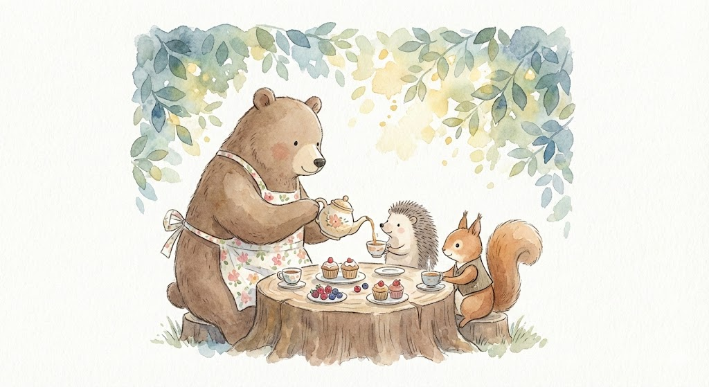 A whimsical watercolor illustration in the distinct style of a charming children's book. The artwork features anthropomorphic animals in a specific, detailed scenario with soft colors, gentle textures, and a hand-drawn feel on a plain white paper background. [A cozy forest tea party scene. A friendly brown bear wearing a floral apron pours tea for a hedgehog and a squirrel at a small wooden stump table. The table is laden with tiny cupcakes and berries. Sunlight filters through watercolor leaves above them. The mood is warm and peaceful.]
