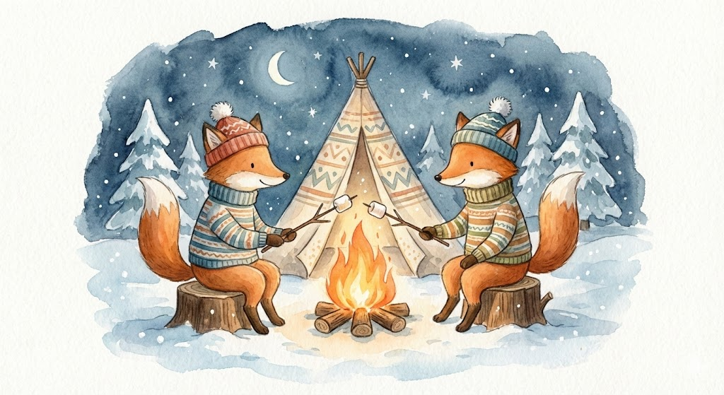 A whimsical watercolor illustration in the distinct style of a charming children's book. The artwork features anthropomorphic animals in a specific, detailed scenario with soft colors, gentle textures, and a hand-drawn feel on a plain white paper background. [A snowy winter camping scene at night. Two foxes in knitted sweaters and hats are toasting marshmallows over a small campfire next to a cute tent. A crescent moon and stars are visible in the watercolor sky. Snowflakes are gently falling. The lighting is warm from the fire against the cool blue snow.]