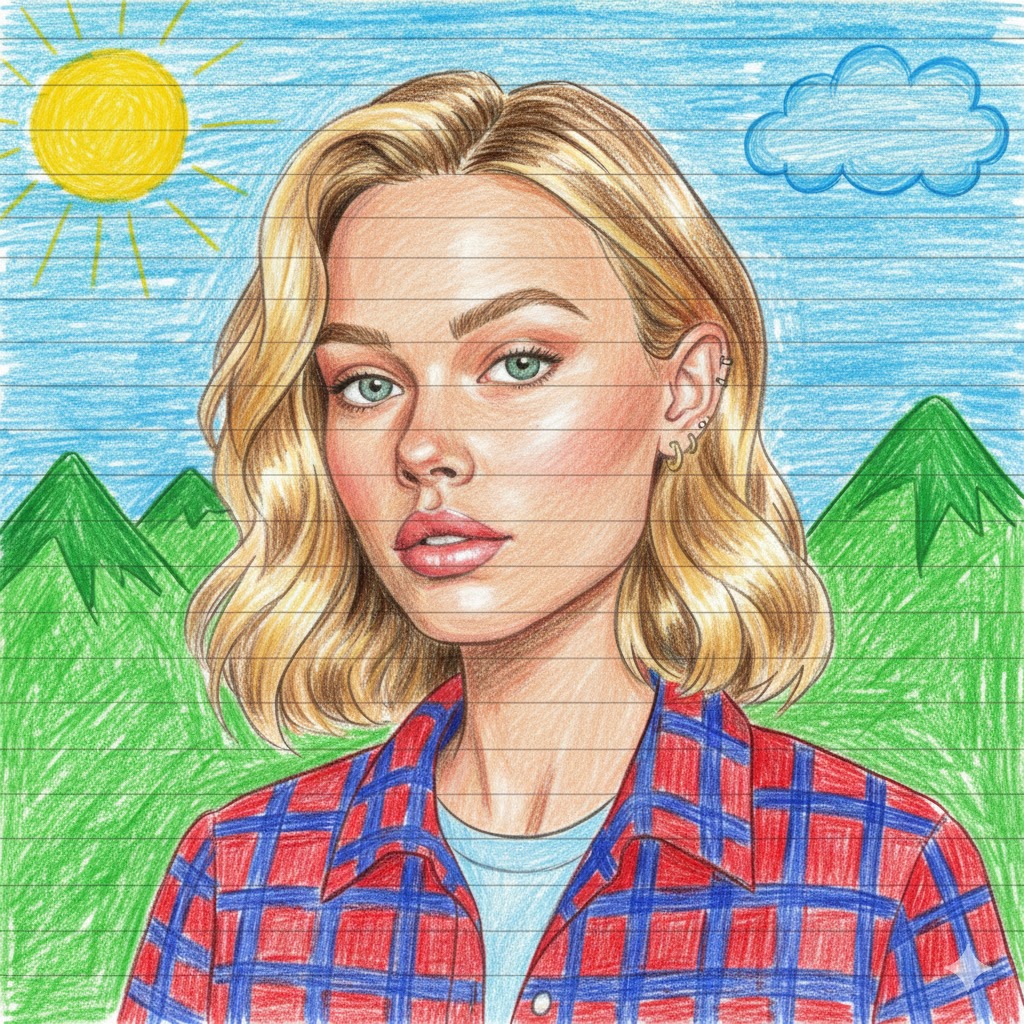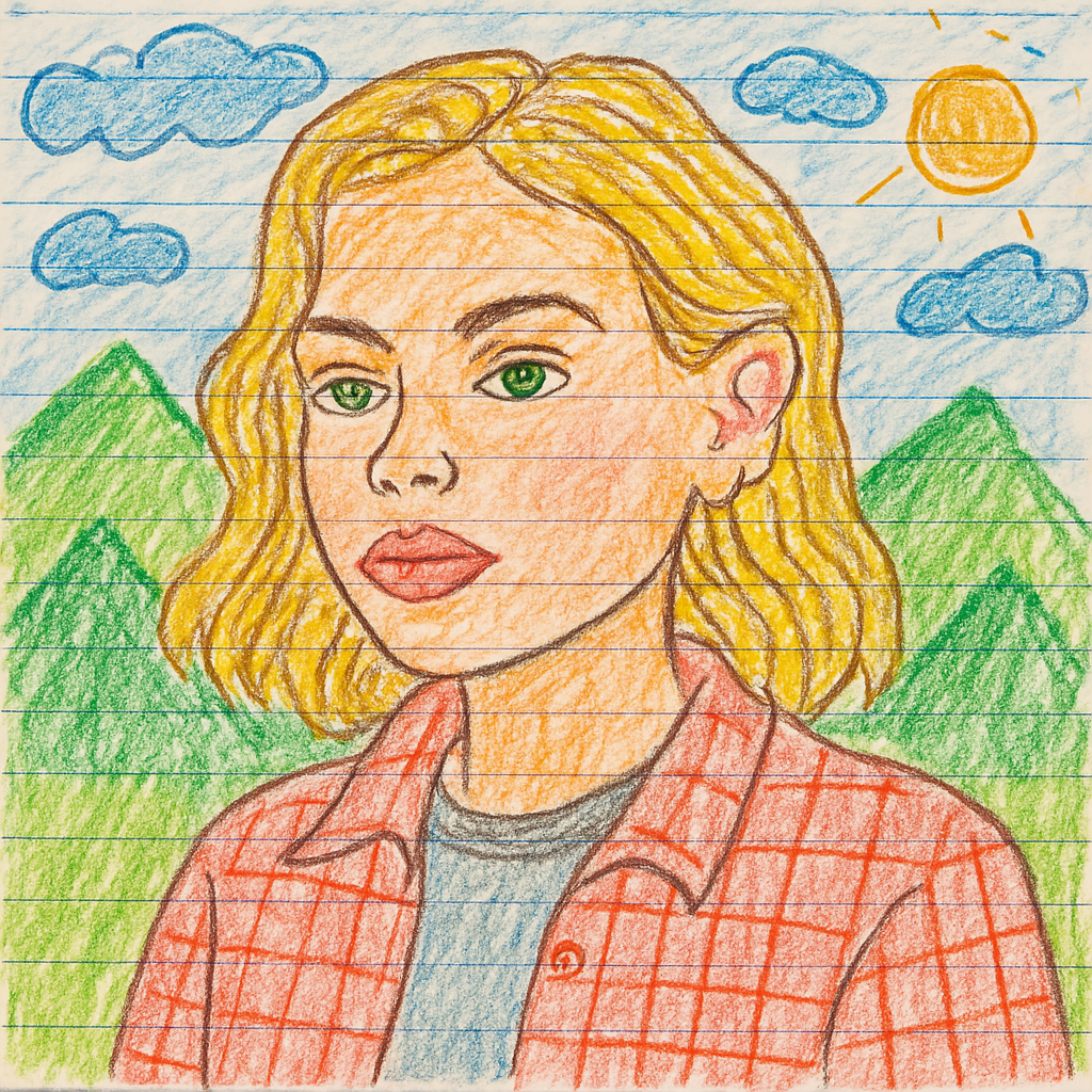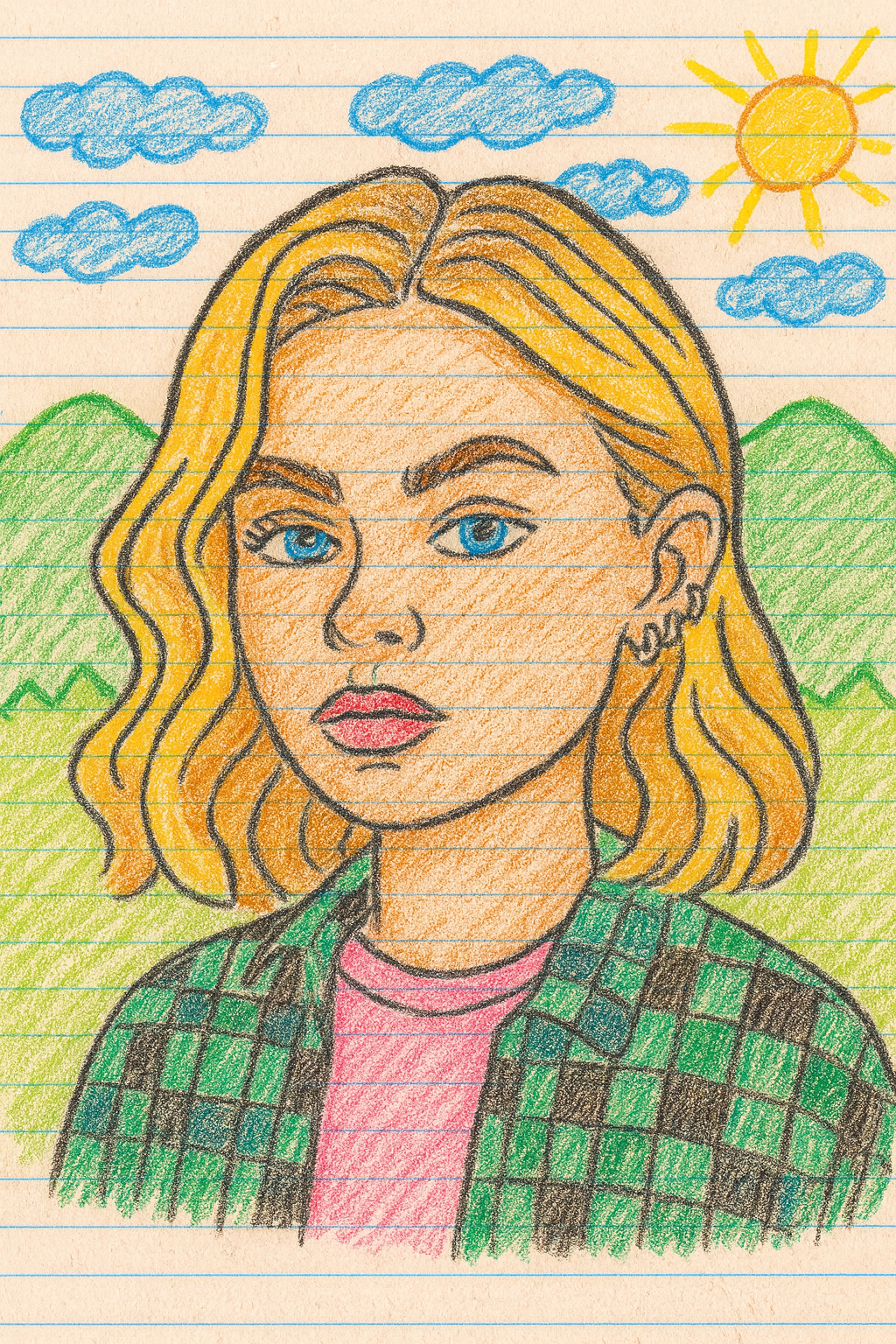 A hand-drawn colored pencil portrait of the image in the uploaded photo (exact 1:1 facial resemblance and identical hairstyle - no beautification or identity alteration), wearing [a checkered shirt and T-shirt]. The style is vibrant like a child's drawing on [lined paper], but with slightly uneven coloring. The background features green mountains, blue sky, a bright yellow sun, and blue clouds, all drawn in the same pure, childlike style. The face in the image has some shading and detail, but the overall impression is charmingly amateurish.