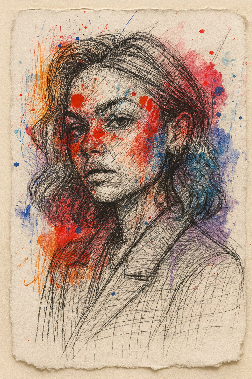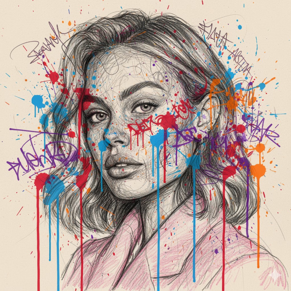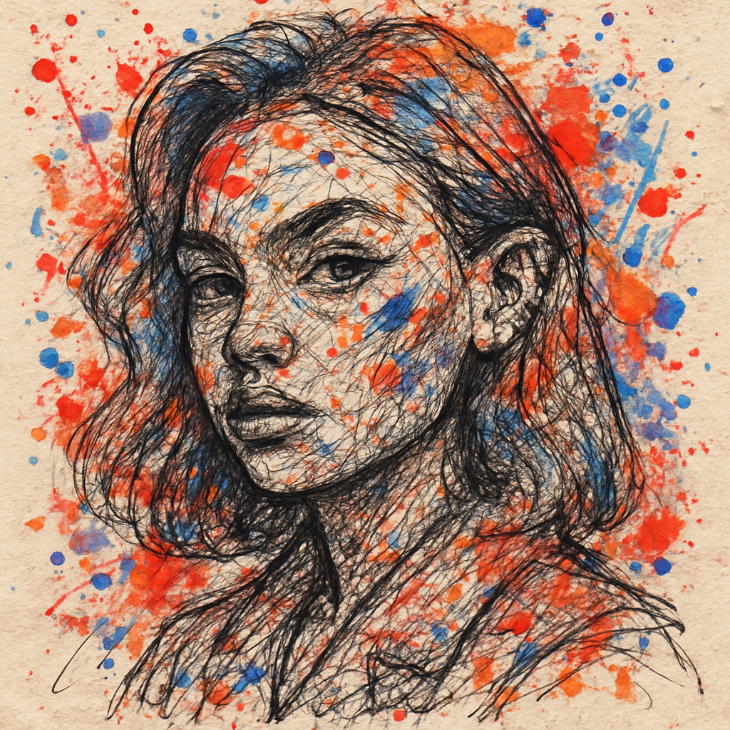 Change the uploaded image. It's a rough, hand-drawn sketch combining graffiti and urban diary styles, with the face and shirt composed of chaotic pencil sketch lines. Vibrant red, blue, orange, and purple ink splatters cover the face and background, showcasing expressive line work and a rough paper texture. It possesses a vibrant and lively visual tone, characterized by abstract and journalistic brushwork influenced by street art.