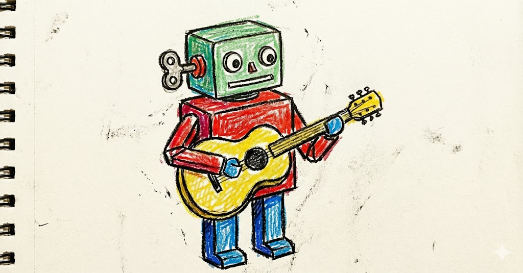 "A playful, hand-drawn sketch created with thick wax crayons. It shows [a cute, boxy retro robot playing a yellow acoustic guitar]. The coloring is messy but expressive, using bright greens, reds, and blues. The texture of the paper is visible, adding to the warm, nostalgic scrapbook aesthetic."