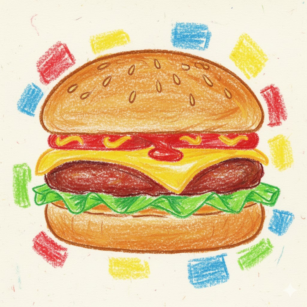 "A whimsical, child-like drawing of [a giant, delicious cheeseburger with dripping cheese and fresh lettuce]. The art style mimics a rough crayon sketch with bold, uneven outlines and solid blocks of primary colors. The background features abstract rectangular strokes of color on beige paper."