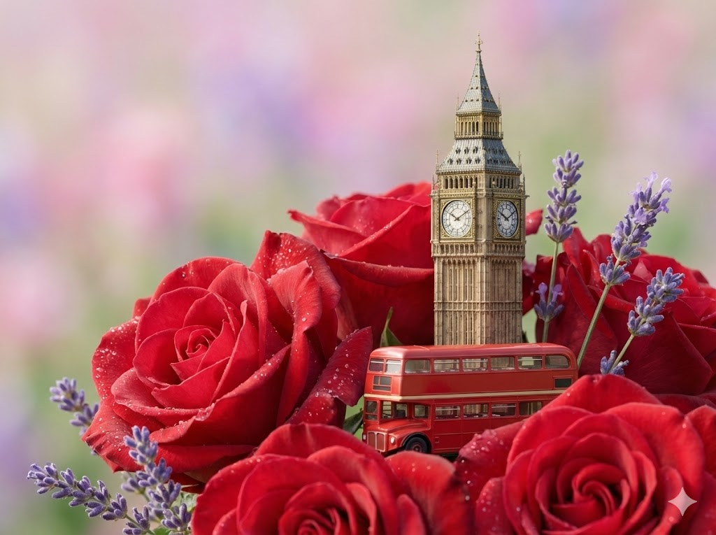 Macro photography of a miniature diorama representing London. The scene features a delicate, highly detailed model of Big Ben and a red double-decker bus gracefully surrounded by oversized, vibrant, and realistic flowers such as classic red roses and English lavender. The composition uses a shallow depth of field with a soft-focus, minimalist background to create a dreamy and whimsical atmosphere. Natural, soft sunlight illuminates the scene, highlighting the intricate textures of the miniature models and the delicate petals. High resolution, 8k, photorealistic style, cinematic lighting, pastel color palette. --ar 4:3