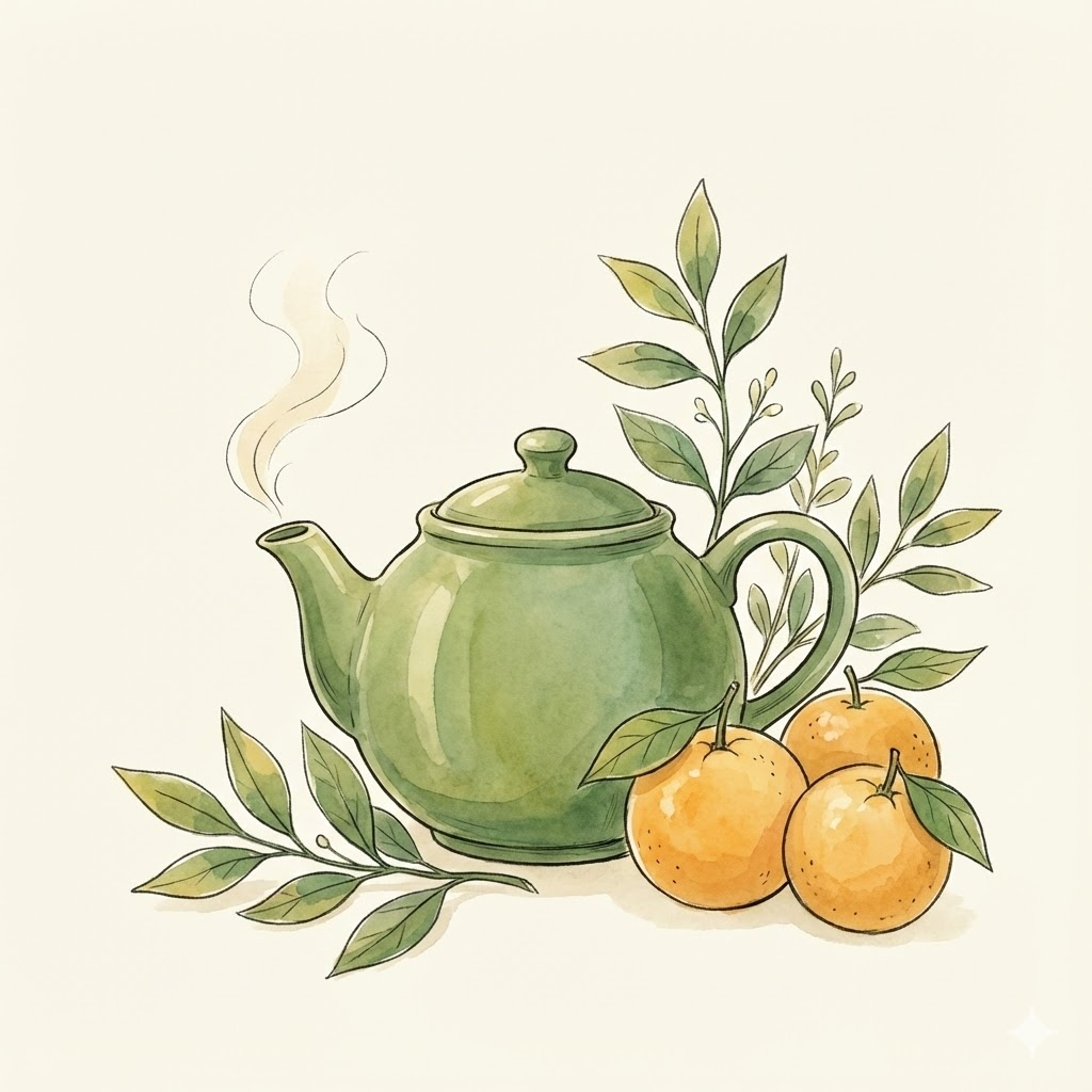 A soft watercolor and ink illustration in the style of children's book art, depicting [a ceramic teapot next to fresh oranges and green leaves]. The image is rendered in a warm, muted palette of greens, yellows, and cream on a plain off-white background. The lines are flowing and delicate, with gentle color washes and lyrical details.