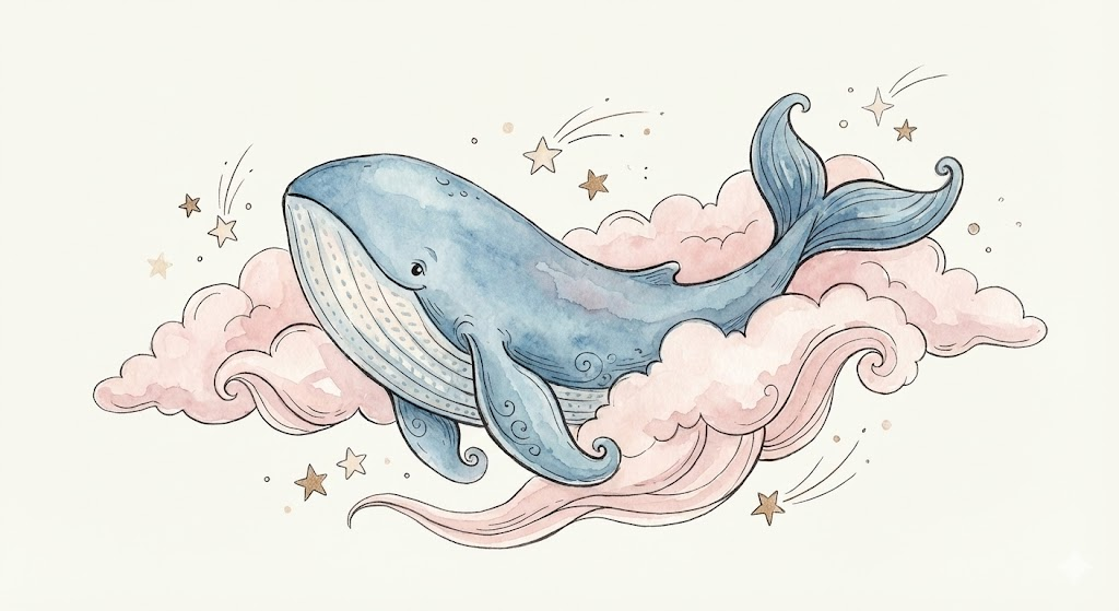 A soft watercolor and ink illustration in the style of children's book art, depicting [a whimsical blue whale swimming through fluffy pink clouds, surrounded by small sparkling stars]. The image is rendered in a soft palette of blues, pinks, and cream on a plain off-white background. The lines are flowing and delicate, with gentle color washes and lyrical details.