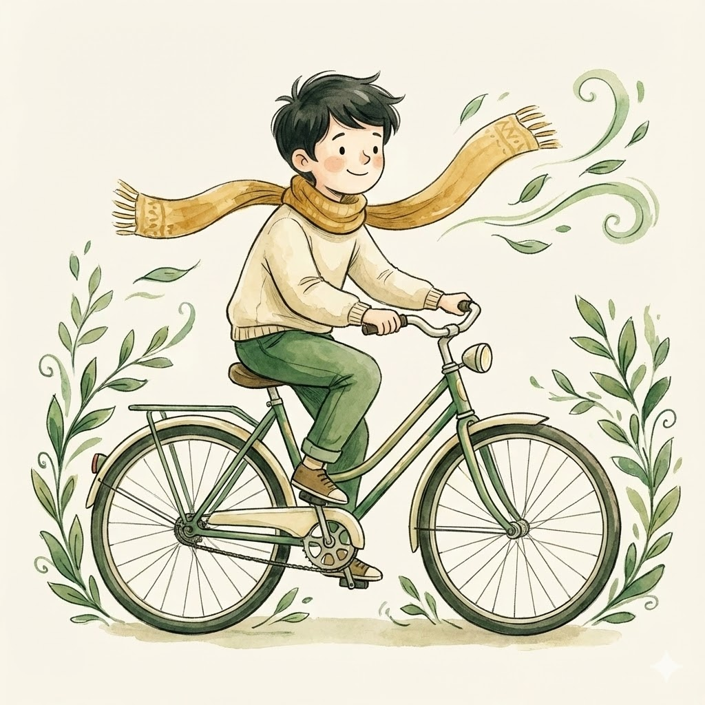A soft watercolor and ink illustration in the style of children's book art, depicting [a happy boy riding a bicycle with a scarf fluttering in the wind]. The image is rendered in a warm, muted palette of greens, yellows, and cream on a plain off-white background. The lines are flowing and delicate, with gentle color washes and lyrical details.