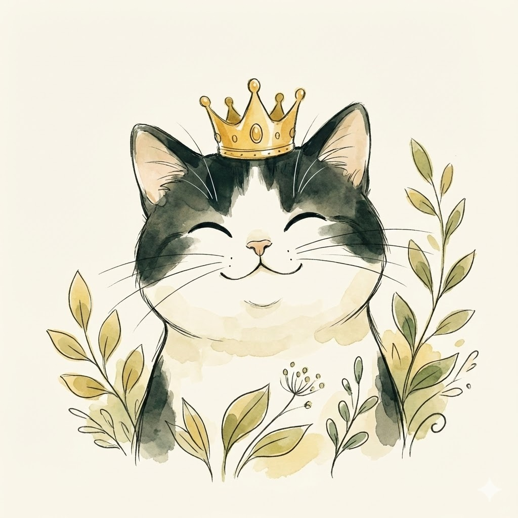 A soft watercolor and ink illustration in the style of children's book art, depicting [a cute smiling cat wearing a small golden crown]. The image is rendered in a warm, muted palette of greens, yellows, and cream on a plain off-white background. The lines are flowing and delicate, with gentle color washes and lyrical details.