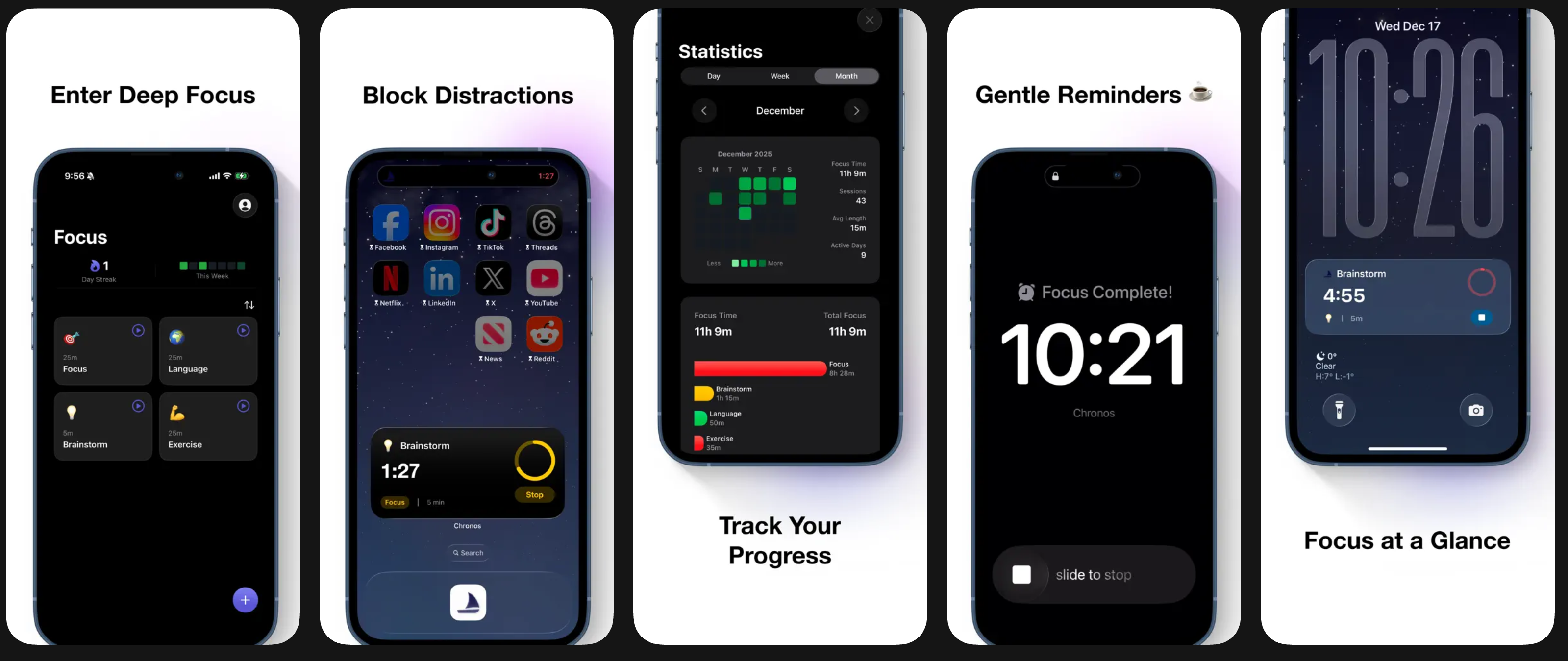 공부나 업무 중에 자꾸 인스타그램이나 유튜브에 손이 가나요? 크로노스는 애플의 Family Controls(스크린 타임) 기술을 사용해 집중 시간 동안 유혹적인 앱들을 확실하게 차단해 줍니다.