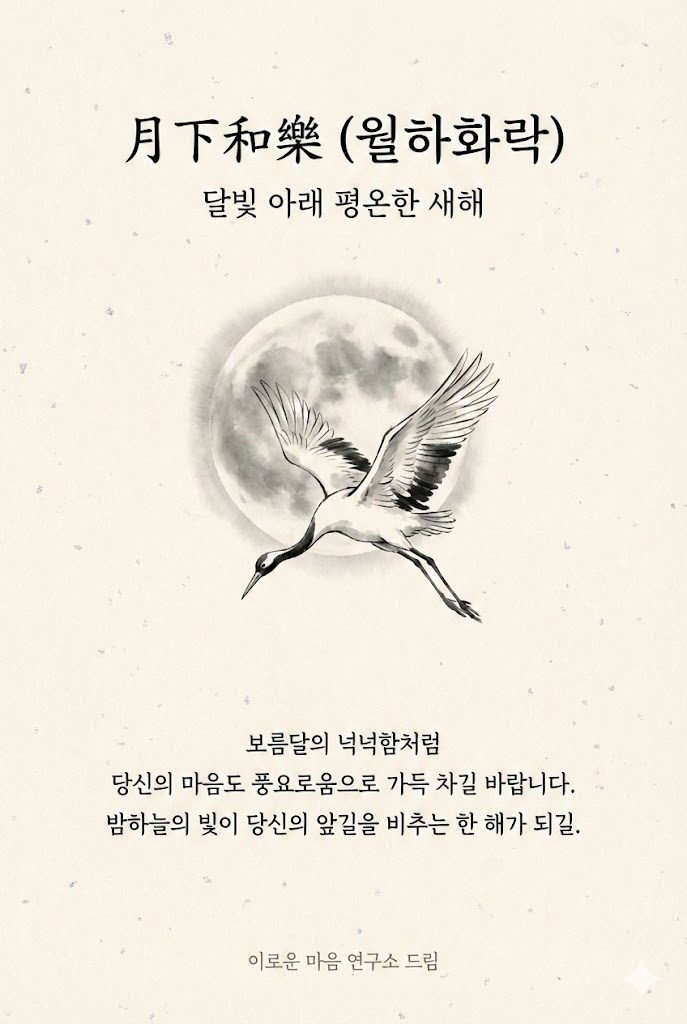 Header: At the top center, place a clean title written with an ink brush: [月下和樂 (월하화락)]. Below it, add a small, sophisticated subtitle: [달빛 아래 평온한 새해].